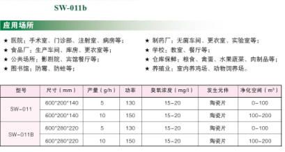 产品特点:体积小、操作简便、产量可调、定时运行、可调时间 应用场所: 制药厂:无菌车间、更衣室、实验室等; 食品厂:生产车间、库房、更衣室等; 学校:教室、餐厅等; 公共场所:影剧院、宾馆餐厅、舞厅、美容院等; 仓库保鲜:粮食、禽蛋、水果蔬菜、肉制品等; 图书馆:防霉、防蛀等; 畜牧业:室内养鸡场、动物饲养场; 大型楼宇的中央空调等。